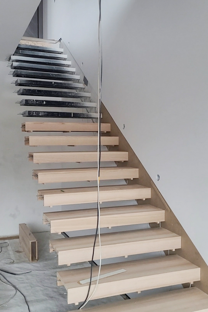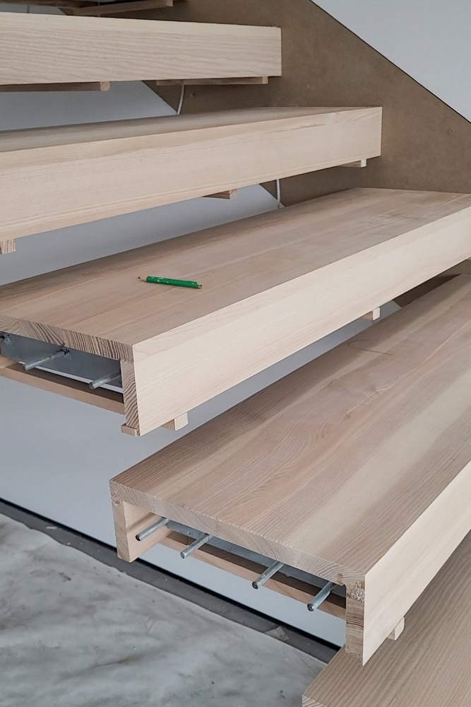- Изготовление облицовочных деталей – ступени и боковые панели из массива ясеня были подготовлены в мастерской, с учетом особенностей каркаса и будущего крепления;