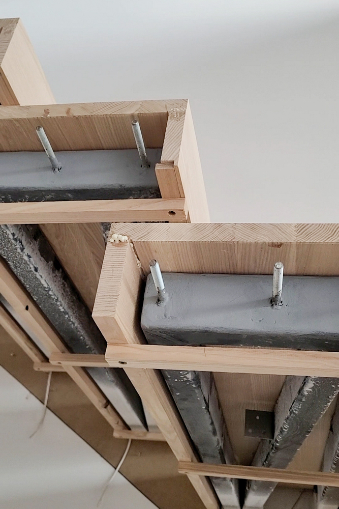 - Дополнительное усиление несущей балки. Внесли корректировки в систему крепления балки к стене, усилив соединение с помощью анкерных болтов и дополнительных металлических элементов. Это обеспечило жесткость конструкции и исключило люфты.
