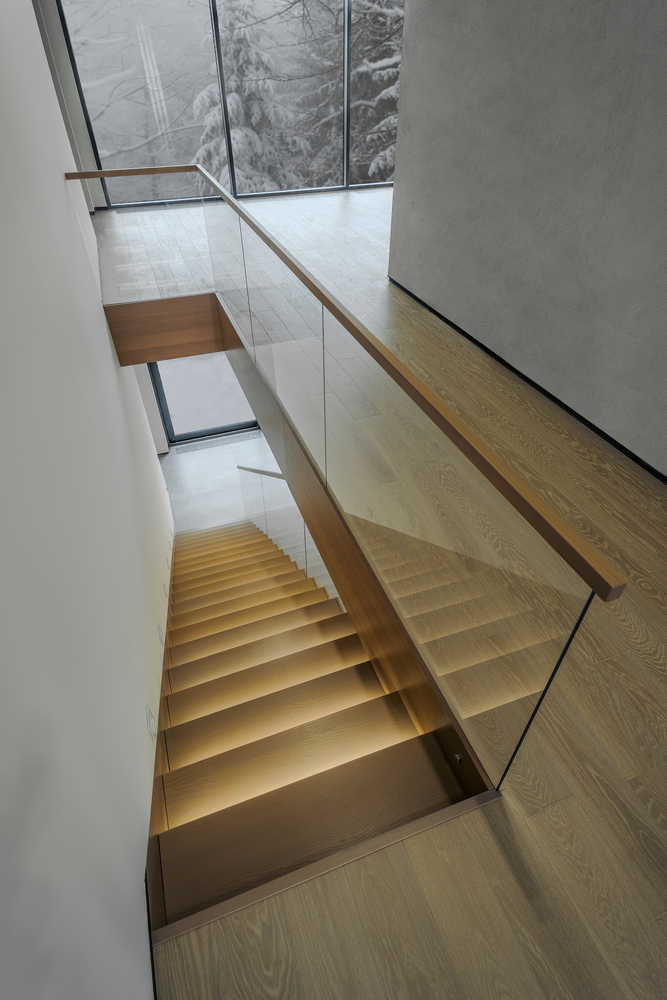 Стеклянные ограждения — это современное решение, которое позволяет сочетать безопасность, стиль и визуальную легкость конструкции. Они идеально подходят для современных стилей интерьера, где важны пространство, свет и минимализм. Такие ограждения выполняют сразу несколько функций: защищают от падений, делают лестницу более выразительной и в некоторых случаях даже усиливают ее жесткость. В этом проекте стеклянное ограждение стало не только эстетическим элементом, но и конструктивным решением, обеспечившим дополнительную устойчивость лестницы.