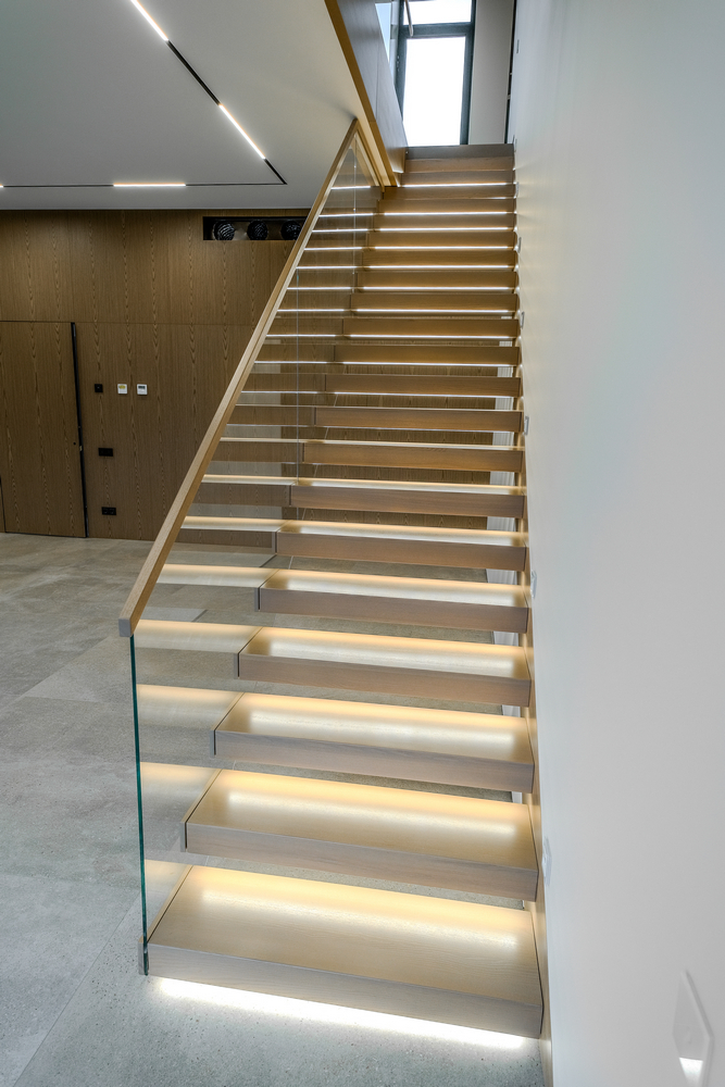 Встроенная подсветка сделала лестницу настоящим декоративным акцентом интерьера. Благодаря этому решению лестница приобрела дополнительный функционал, гармонично сочетая комфорт, стиль и инновационные технологии.