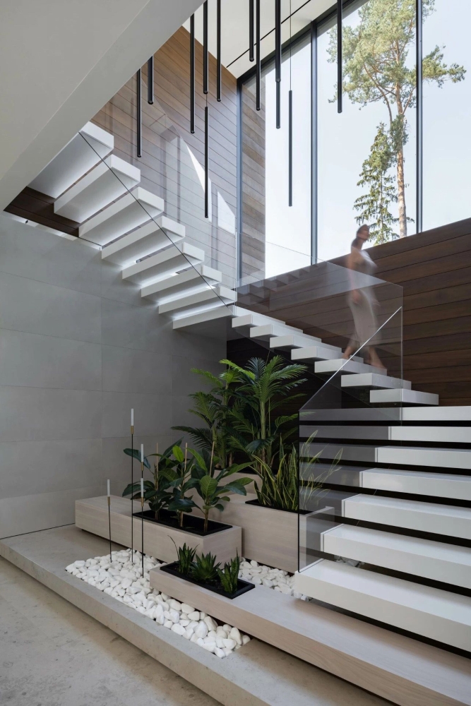 Чаще всего консольные конструкции выбирают для современных, минималистичных и скандинавских интерьеров. Здесь важна простота формы и отсутствие лишних деталей. Они особенно уместны в домах с открытой планировкой и большим количеством естественного света — стеклянные ограждения усиливают ощущение прозрачности и лёгкости.