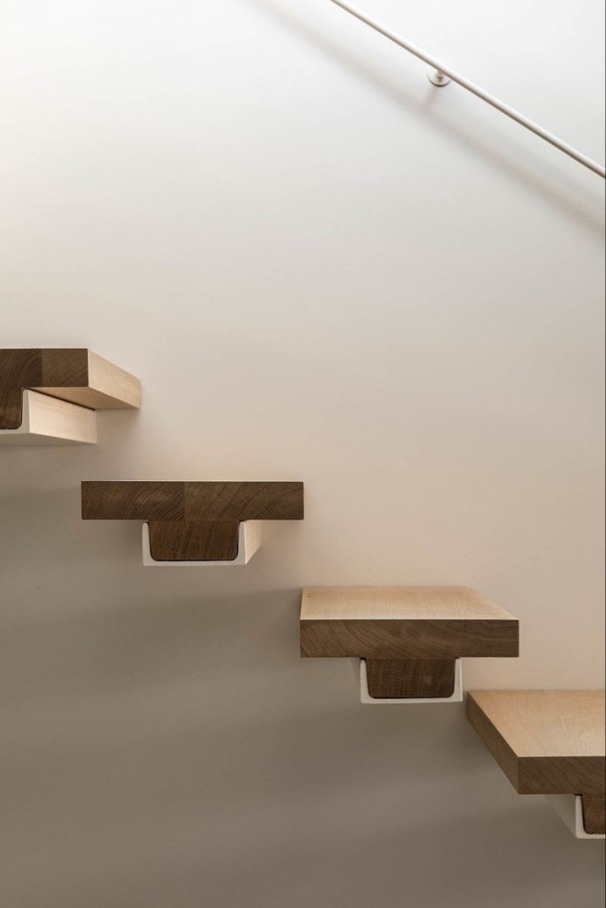 Чаще всего ступени изготавливаются из массива ясеня, дуба или бука — натуральное дерево придаёт конструкции теплоту и характер. В современных интерьерах нередко применяются металл, стекло или камень, а также комбинированные решения, где, например, деревянные ступени дополняются стеклянными ограждениями. Такое сочетание усиливает эффект лёгкости и позволяет вписать лестницу в любой стиль интерьера.