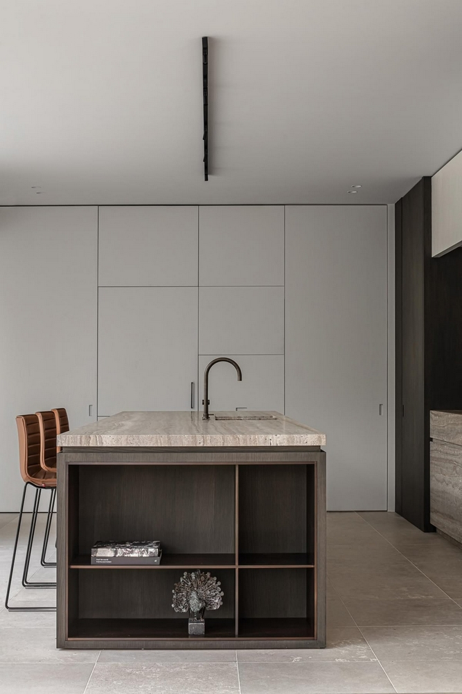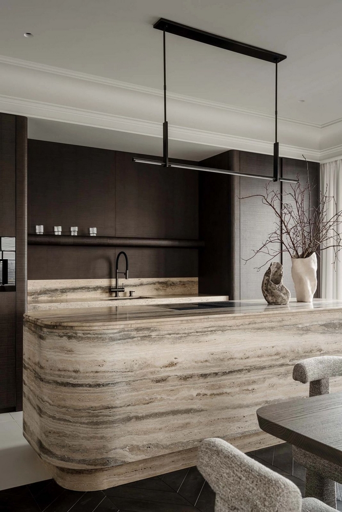 Полуостровная кухня — это вариант, где одна из сторон острова примыкает к стене или основной кухонной мебели, создавая тем самым полуостров. Эта планировка подходит для кухонь средней и большой площади, предлагая дополнительные рабочие поверхности и зону для приема пищи. Полуостров может также использоваться как барная стойка или разделение между кухней и гостиной в открытых планировках.