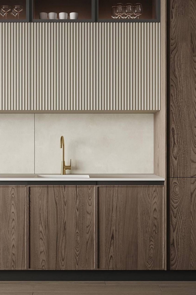 В двухрядной кухне рабочие зоны размещаются вдоль двух противоположных стен. Эта планировка позволяет оптимально использовать пространство, предоставляя достаточно места для хранения и работы. Она особенно удобна в длинных и узких кухнях, но важно соблюдать минимальное расстояние между рядами, чтобы обеспечить свободное передвижение.