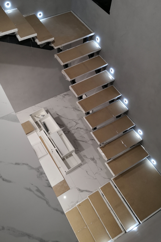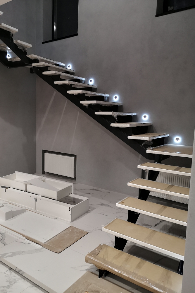 После изготовления лестницы на косоурах, следующим этапом является монтаж. Квалифицированные специалисты производят установку лестницы согласно проектно-технической документации. Это обеспечивает надежность установки, точность примыкания смежных элементов и безопасность всей конструкции.