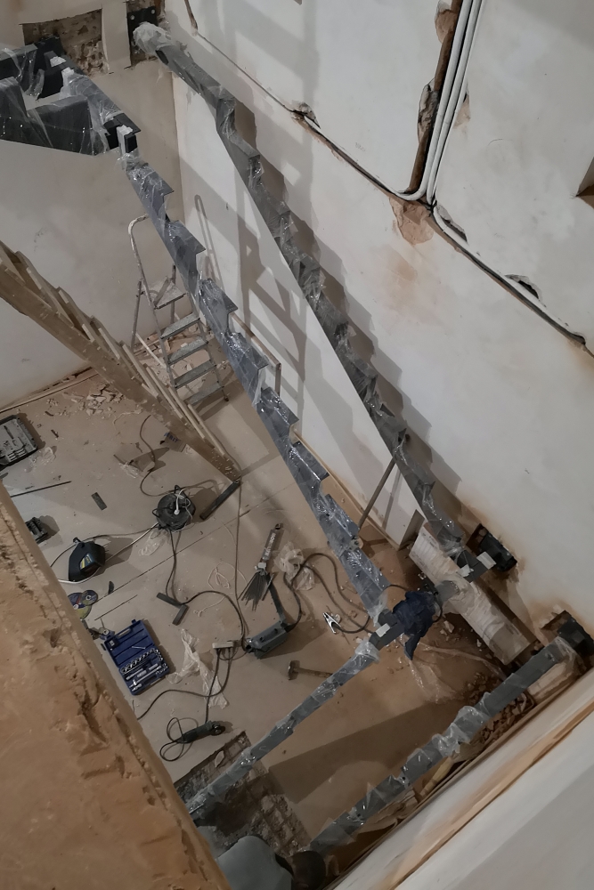 Замер помещения, где планировалась лестница на второй этаж осуществлялся еще на этапе строительства основных перегородок дома. Такой подход позволяет учесть все нюансы при проектировании лестницы, сделать нужные закладные и выполнить монтаж всех элементов лестницы максимально точно.
