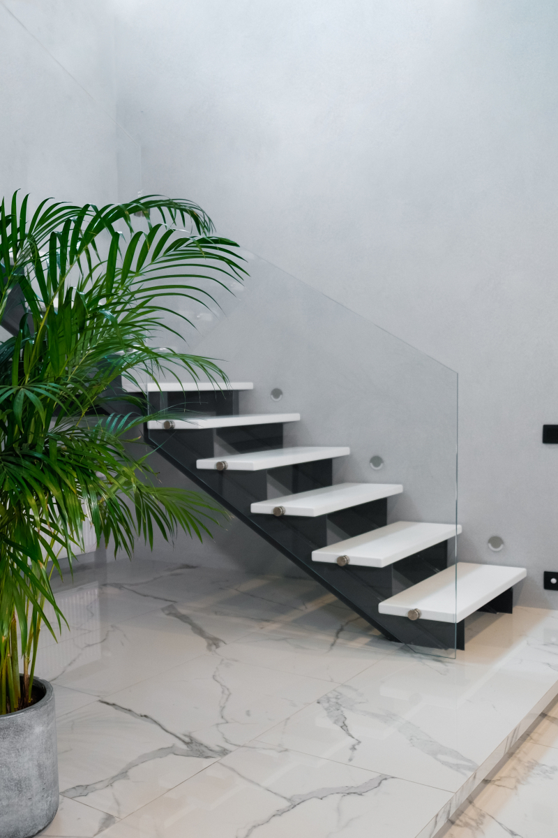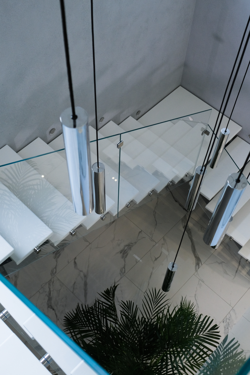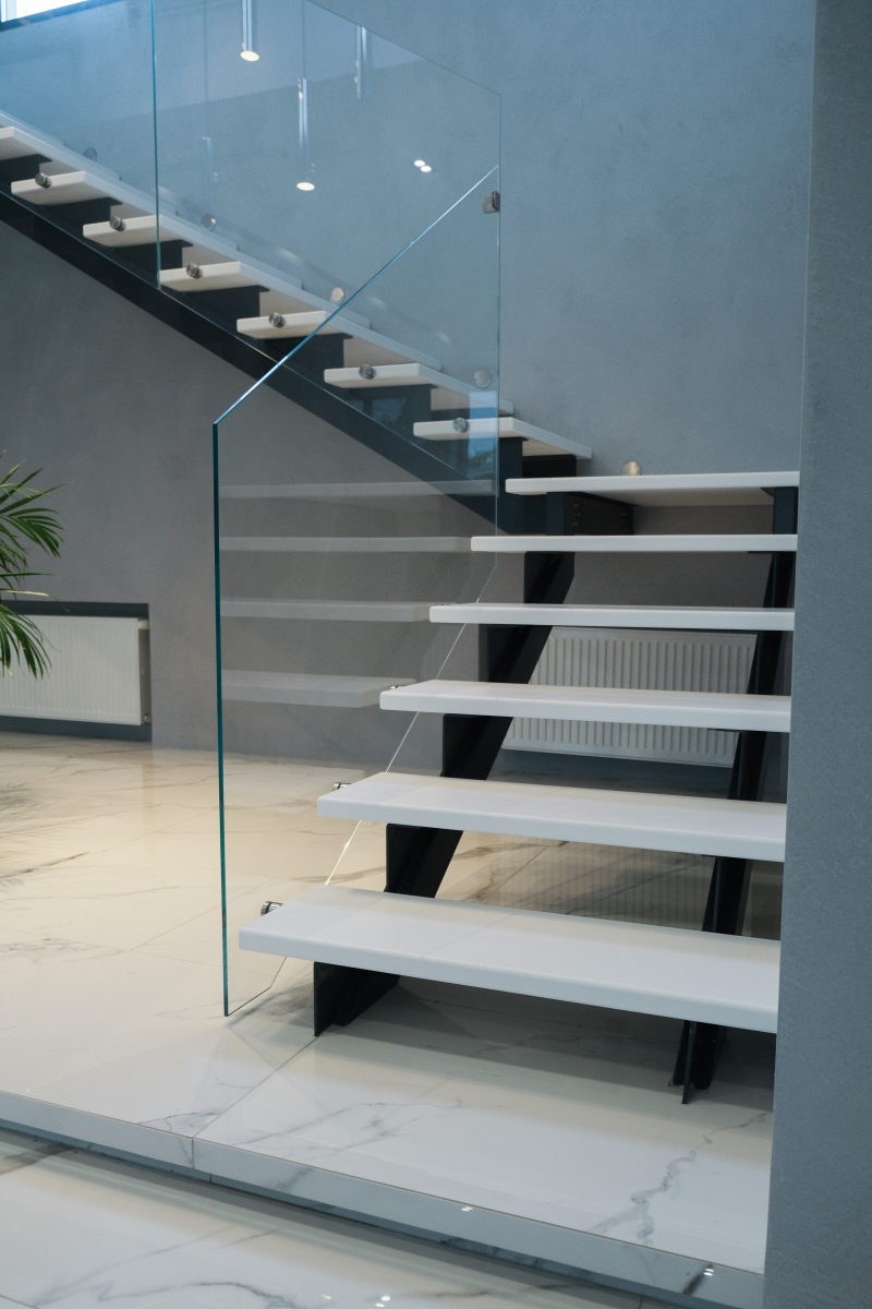 Функцию ограждения лестницы выполняет сверхпрозрачное стекло толщиной 10 мм, что создает ощущение легкости и простора в интерьере. Стекло закреплено на ступенях с использованием нержавеющей фурнитуры, что обеспечивает надежность и безопасность при эксплуатации лестницы.