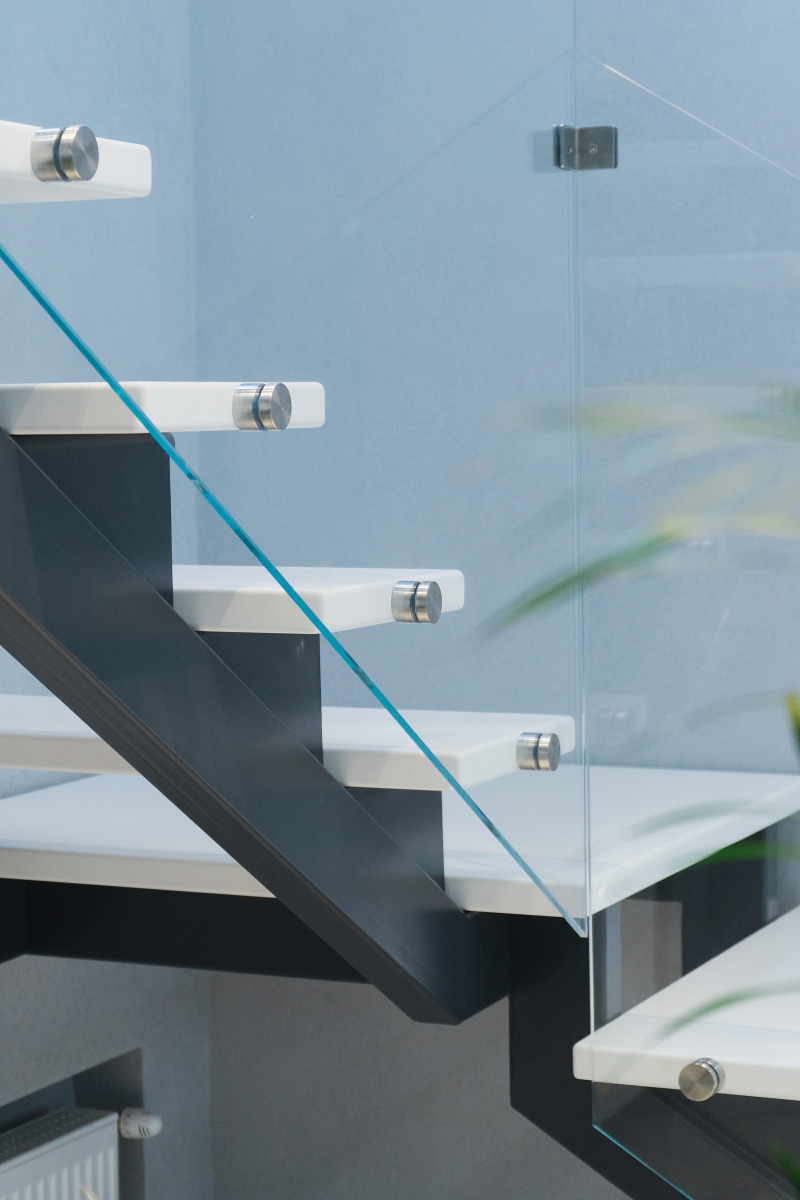 Стеклянное ограждение позволяет сохранить пространство и визуальную легкость конструкции и монтируется уже после установки ступеней. Такая последовательность монтажа необходима для достижения требуемой надежности соединений и точности примыканий стеклянного ограждения.