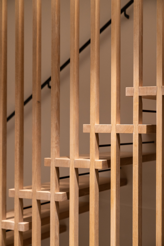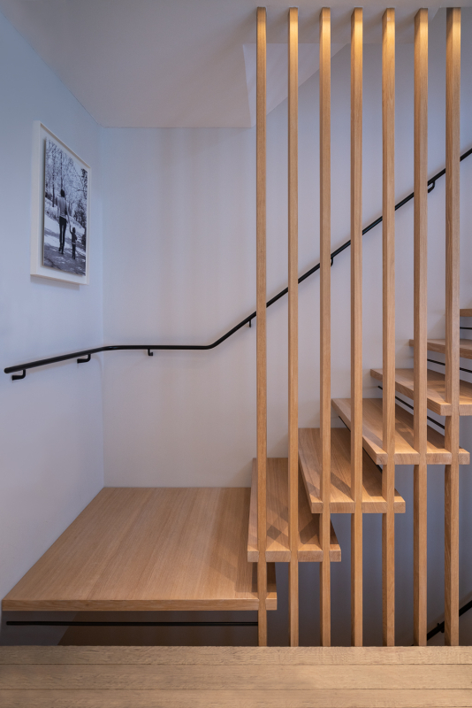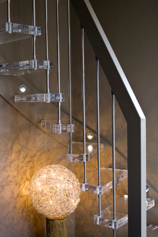В большинстве конструкций лестниц на больцах отсутствуют подступенки, что усиливает эффект лёгкости и прозрачности. Такой дизайн позволяет свету свободно проходить через лестницу, улучшая освещённость пространства.