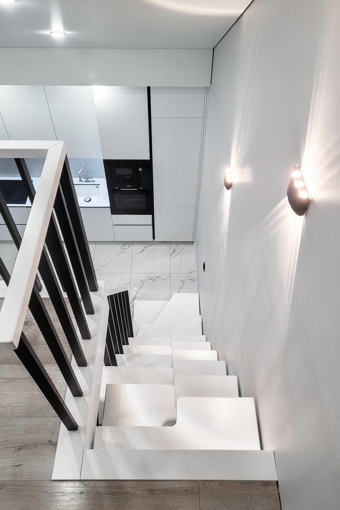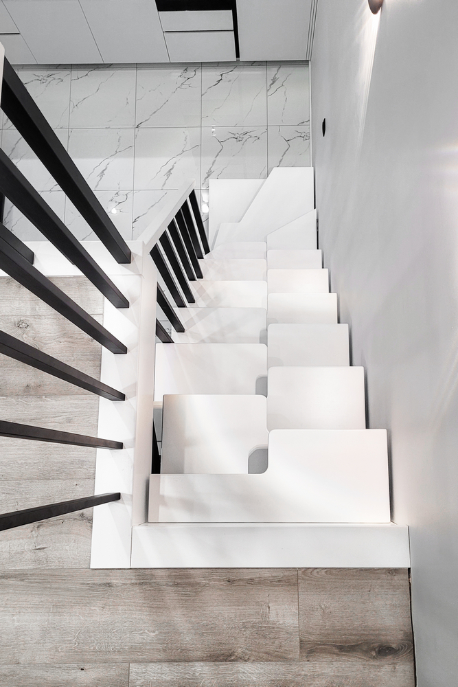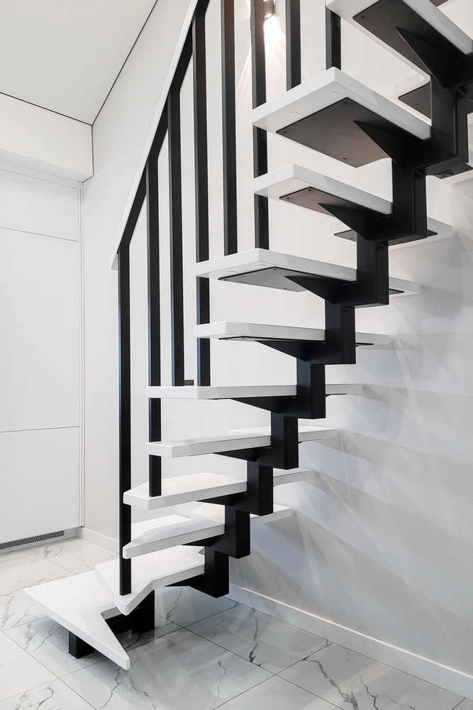 Для каркаса выбрали металлический косоур, окрашенный в чёрный цвет. Он стал основой всей конструкции — прочной, устойчивой и визуально лёгкой. Ступени выполнили из массива ясеня, затем выкрашенные в белый цвет. Контраст чёрного и белого подчеркнул графичность и современный характер интерьера, а также позволил визуально «разгрузить» пространство.