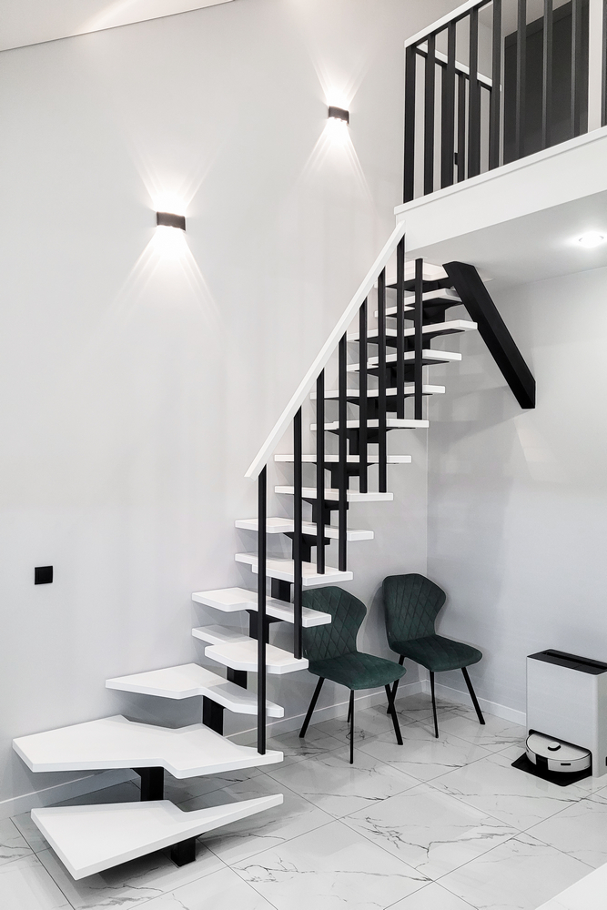 Ещё одно преимущество — возможность индивидуального дизайна. Лестницы «гусиный шаг» могут быть металлическими, деревянными или комбинированными, с перилами из стекла или лаконичными ограждениями из металла. Благодаря этому конструкция легко вписывается в стилистику современного интерьера — от скандинавского до лофта.