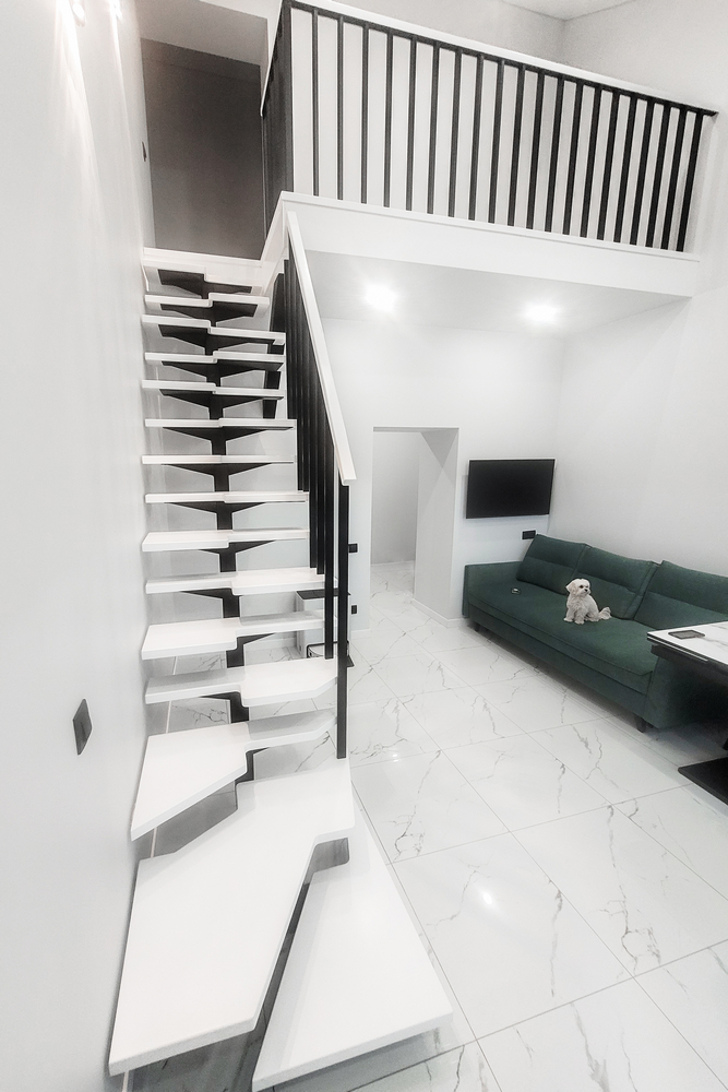 В готовом помещении компактная лестница органично вписывается в общую композицию, подчёркивая лёгкость и современность пространства. Чёрный каркас и светлые ступени создают графичный акцент, который объединяет кухню-столовую с верхним уровнем, не перегружая интерьер. Лестница выглядит как естественное продолжение дизайна: она не «съедает» площадь, а работает на неё, добавляя динамики и характера. В итоге ограниченное пространство превратилось в уютное, функциональное и стильное — где каждый элемент, включая лестницу, служит общей идее комфорта и минимализма.