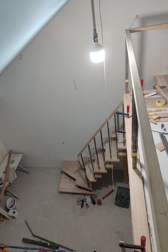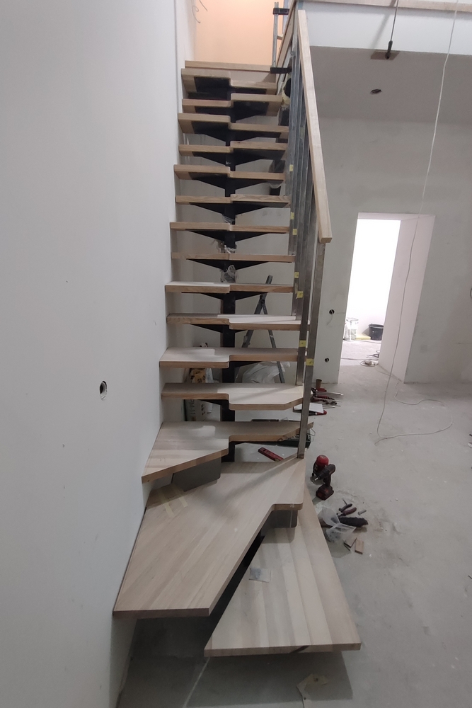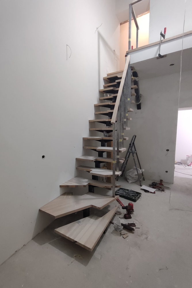 После утверждения концепции мы приступили к изготовлению изделия и предварительному монтажу. На этом этапе важно проверить точность всех соединений, угол наклона, а также эргономику ступеней. Даже при компактных размерах лестница должна быть безопасной, а движение по ней — естественным.