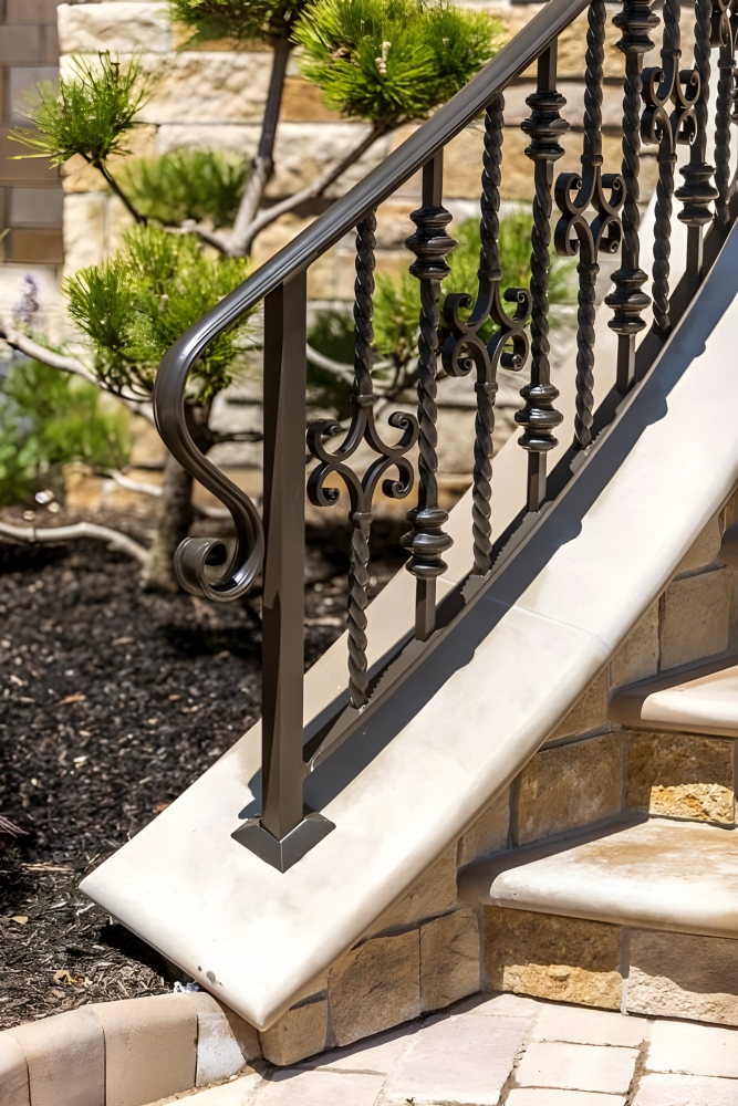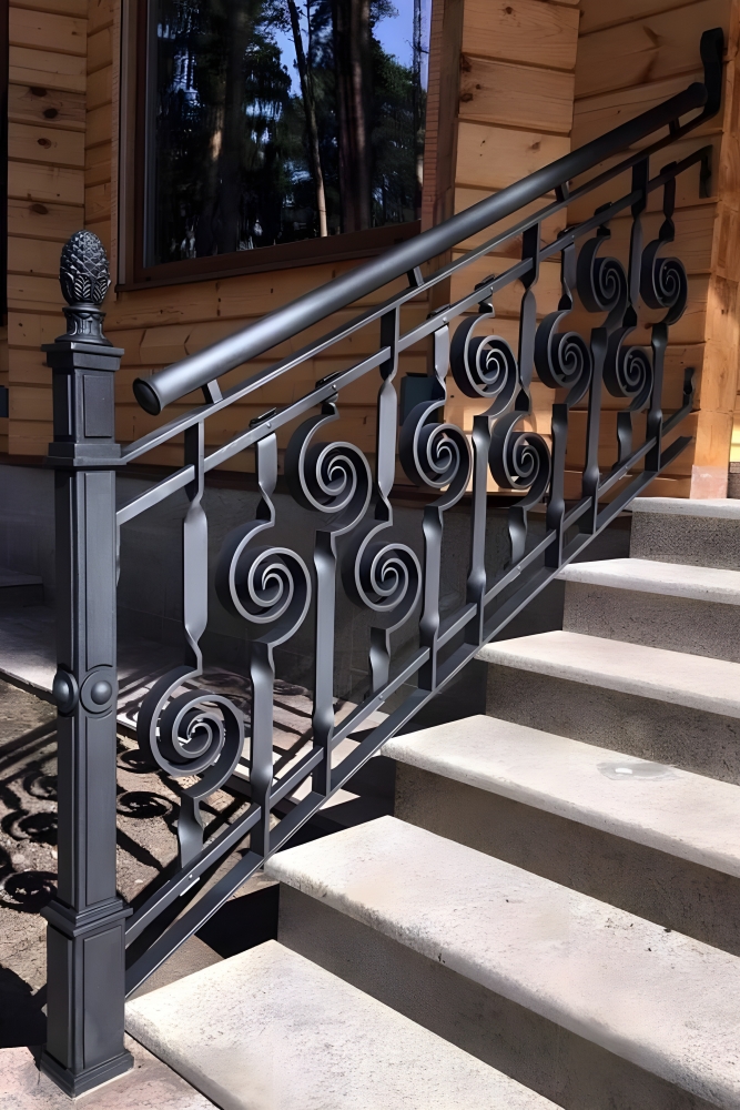 - Індустріальний стиль. Елементи індустріального стилю, такі як груба текстура металу, відкриті зварні шви та заклепки, часто використовуються в сучасних кованих огородженнях. Ці особливості надають конструкціям брутального і сучасного вигляду, що ідеально підходить для лофтів і промислових інтер’єрів.